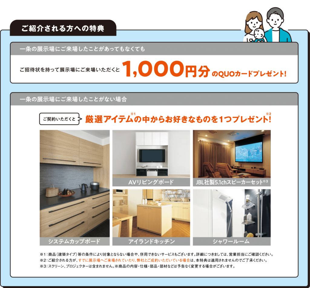 一条工務店の紹介制度とは、既に一条工務店でお家を建てた人,または一条工務店で契約中の方から紹介を受けることで、最大35万円のオプションが無料になる特典が受けられる制度になります。また、紹介を受けた方は、後日一条工務店から招待状が届くのでその招待状を展示場に持っていくと、1,000円分のQUOカードがもらえます。